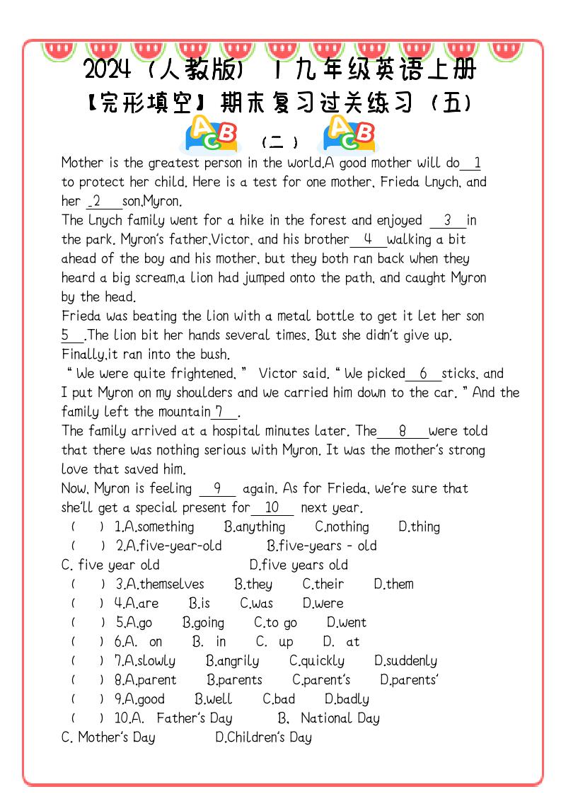 【2025秋新版】九年级英语上册:完形填空期末复习过关练习(5篇)七七23天前更新关注私信0846313【2025秋新版】九年级英语上册:完形填空期末复习过关练习(5篇)此内容为付费阅读,请付费后查看¥9.9钻石会员免费立即购买您当前未登录!建议登陆后购买,可保存购买订单付费阅读 ——预览已结束,还剩9页未读——您已获得此文档下载权限,请点击底部下载完整文档 课程下载: 隐藏内容,请登录后查看 © 版权声明 版权声明 1 本网站名称:七七网创网 2 本站永久网址: https://www.xckj8.cn/ 3 本网站的文章部分内容可能来源于网络,仅供大家学习与参考,如有侵权,请联系七七进行删除处理。 4 本站一切资源不代表本站立场,并不代表本站赞同其观点和对其真实性负责。 5 本站一律禁止以任何方式发布或转载任何违法的相关信息,访客发现请向七七举报 6 本站资源大多存储在云盘,如发现链接失效,请联系我们我们会第一时间更新。 7 本站采用知识共享署名-非商业性使用-相同方式共享4.0国际许可协议进行许可 THE ENDAI技术 喜欢就支持一下吧点赞313 分享QQ空间微博QQ好友海报分享复制链接收藏